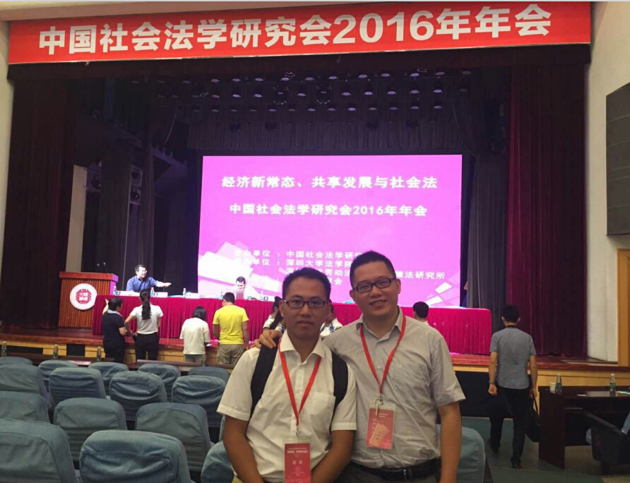 7月16日至17日,中国社会法学研究会2016年年会在深圳大学隆重召开。本次会议由中国社会法学研究会主办,深圳大学法学院、深圳大学劳动法和社会保障法研究中心承办。来自北京大学、中国人民大学、武汉大学经济法研究所、浙江大学、西南政法大学等数十所高校以及政府机关和实务部门的100多位专家学者齐聚一堂,围绕“经济新常态、共享发展与社会法”的主题展开深入研讨。中国社会法学研究会理事、武汉大学经济法研究所讲师、武汉大学经济法研究所劳动和社会保障法研究中心执行秘书班小辉博士以及研究所博士生房海军应邀出席了本次会议。