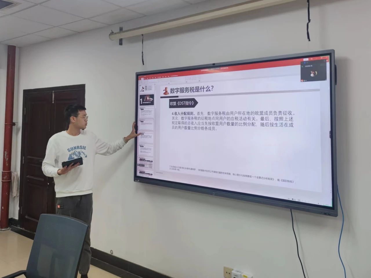 在主题汇报阶段,潘亮从数字服务税的国际实践与历史背景着手,指出数字服务税是数字经济服务接受国应对数字经济发展带来的税款流失问题所采取的一种单边反制方案。他认为尽管数字服务税具有浓厚的政治色彩,但其背后的理论依据确实反映了数字经济发展带来的价值创造方式的改变这一重要问题,对我国区域税收的公平化发展以及对数据资产的征税方案具有一定的借鉴意义。