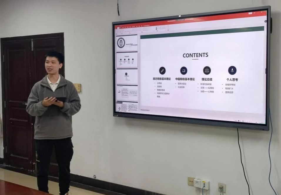 在主题汇报阶段,陈小三梳理了中西方主流的税收基本理论,并就各理论中税收正当性的观点结合社会形态和经济制度进行了穿透分析,发现各理论都代表了当时各阶级的核心利益并贴合当时的社会经济制度,基于以上分析,陈小三试图提出打通各社会形态和经济制度的税收定义。