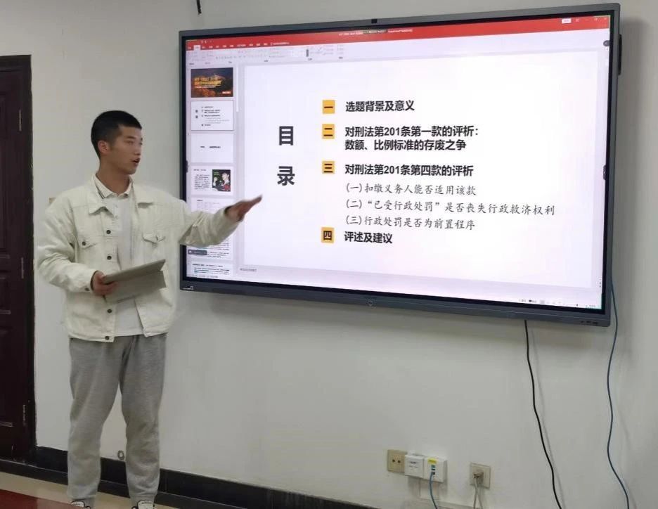 在主题汇报阶段,陈志一首先介绍了选题背景,随后对刑法第201条第一款和第四款进行了评述,并在考虑实践效果的基础上提出了在保留“数额+比例”标准的基础上增设数额例外标准、在明确行政前置的基础上确认行为人申请复议和提起诉讼的权利以及明确税务机关的移交义务的建议。