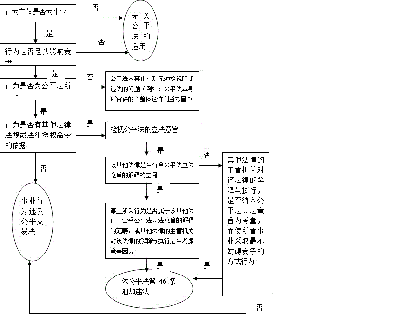 台湾“公平交易法”第46条对该法的法律适用做了除外规定,是台湾区隔竞争法与产业管制法适用的关键条文。修正前的台湾“公平交易法”第46条规定:“事业依照其他法律规定之行为,不适用本法之规定。本法未规定者,适用其他有关法律之规定。”以“公平法”为普通法,而优先适用其他的特别法。1999年修正后的“公平交易法”第46条规定:“事业关于竞争之行为,另有其它法律规定者,于不抵触本法立法意旨之范围内,优先适用其它法律之规定。”新的第46条使“公平交易法”对于其它法律排除公平法适用有了反排除的可能。按照台湾主流的见解,“公平交易法”第46条是一种行为违法性阻却,“公平交易法”仅当系争行为被公平交易法所禁止,而其它法律不禁止的情形下,才可以排除适用。即只有“公平法”中的“禁止规定”才有排除适用的可能,且只当其他法律(含法规命令)有与该禁止规定内容相反的“强制”或明确“许可”规定的情形,才会排除适用。台湾“公平交易委员会”的执法实务也一向采此观点。台湾“公平交易法”第46条的适用流程如下图所示: