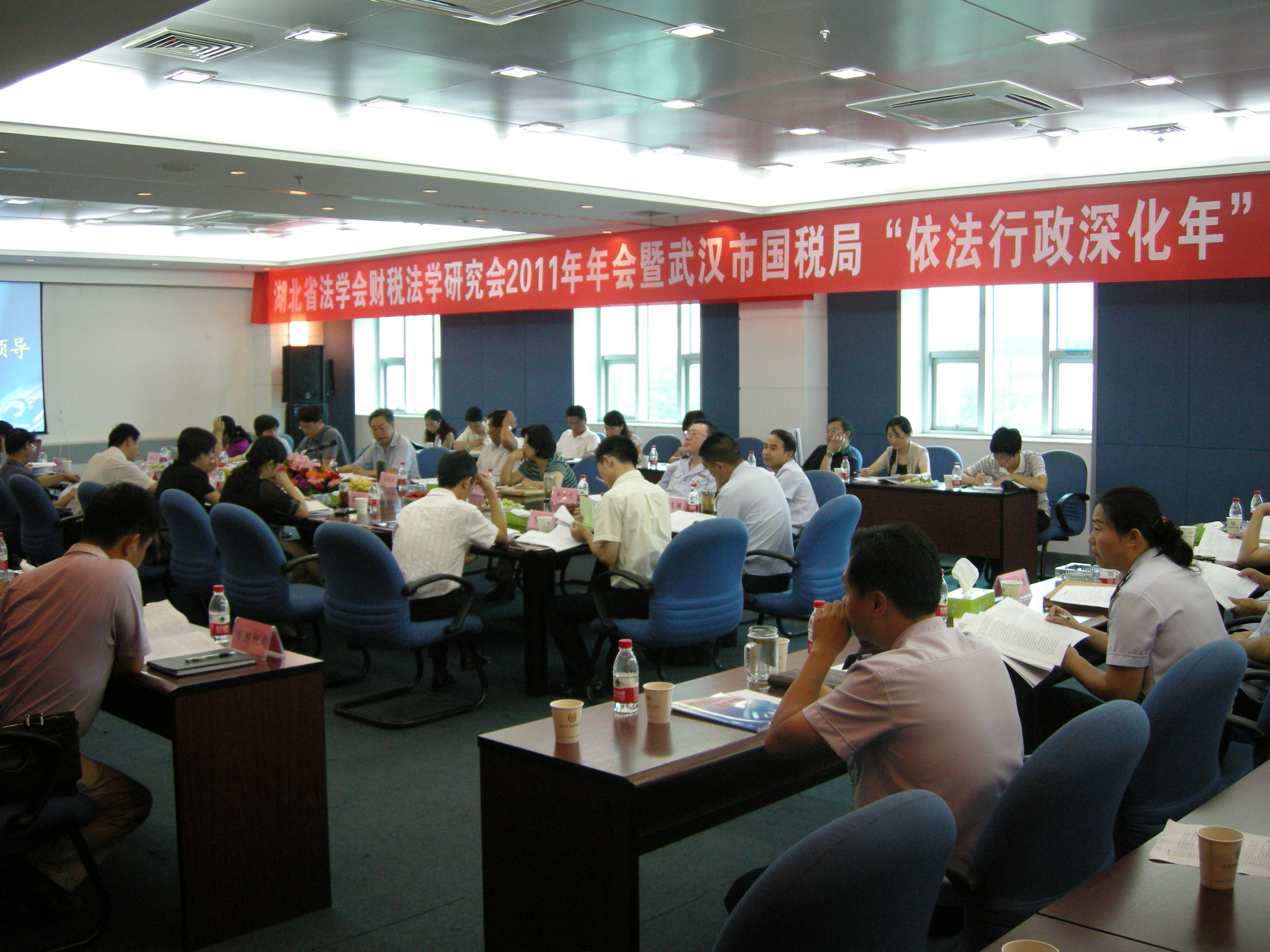 2011年8月26日,“湖北省法学会财税法学研究会2011年会暨武汉市国税局‘依法行政深化年’活动专题研讨会”在武汉市烽火科技大厦第一会议室隆重召开,会议由武汉市国税局第五稽查局和武汉市洪山区国税局联合承办。研究会顾问、武汉大学经济法研究所财政金融研究中心主任吴俊培教授,湖北省法学会吴本清秘书长,武汉市国税局政策法规处处长严少平应邀参会并分别致辞。湖北省法学会财税法学研究会会长、武汉大学经济法研究所税法研究中心主任熊伟教授代表研究会作了年度工作报告。来自省法学会领导、武汉市国家税务局领导及业务骨干、财税法研究会理事、市内高校研究生共50余人参加了此次会议。开幕式由武汉大学经济法研究所法学院崔晓静副教授主持。